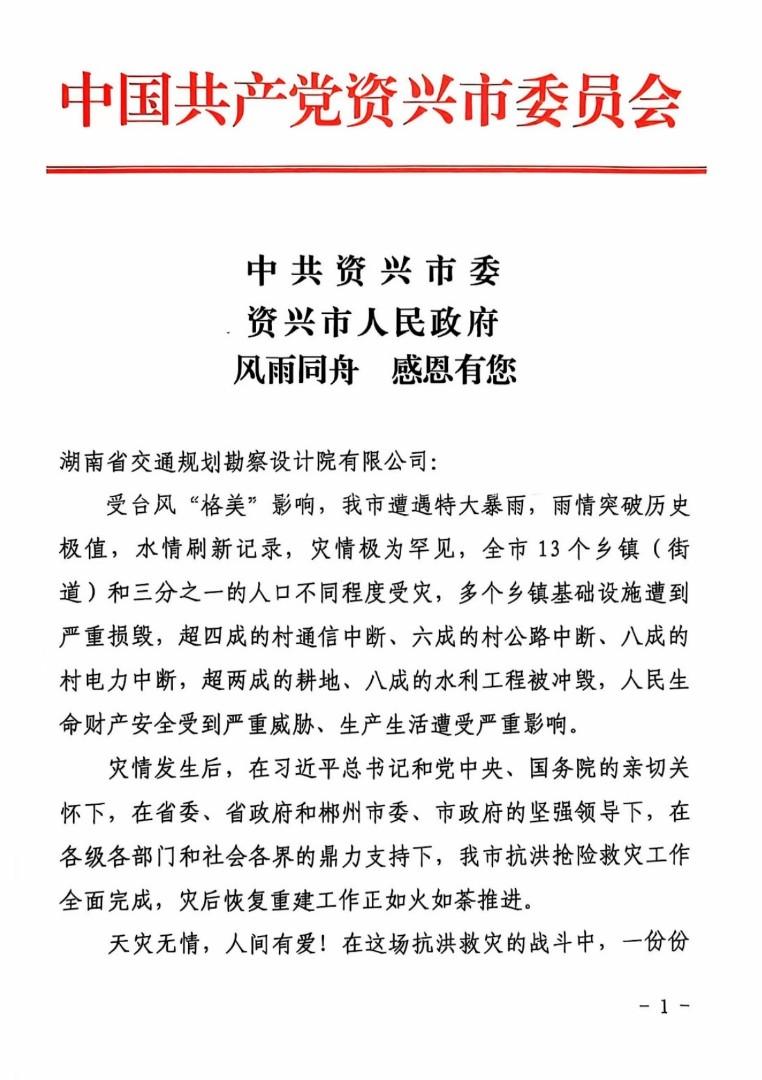 近日,中共資興市委、資興市人民政府發(fā)來感謝信,信中高度評價了湖南省交通規(guī)劃勘察設(shè)計院有限公司在馳援資興搶險救災(zāi)及災(zāi)后恢復(fù)重建工作中展現(xiàn)的擔(dān)當(dāng)精神和技術(shù)水平,對公司作出的積極貢獻(xiàn)表達(dá)了誠摯的感謝。信中指出,資興市此次遭遇災(zāi)情極為罕見,多地基礎(chǔ)設(shè)施遭到嚴(yán)重?fù)p毀、大范...